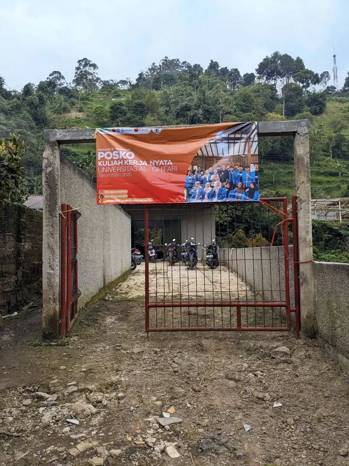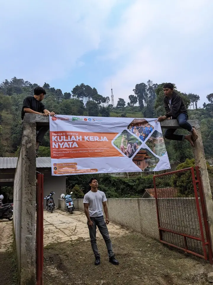 Puas di dalam, kami pindah ke halaman depan. Bersama-sama, beberapa orang memegang ujung spanduk berukuran besar, sementara yang lain memanjat tangga untuk menancapkan tali pengikat. Spanduk bertuliskan “Posko KKN Kelompok 7 – Desa Pagerwangi” kini terpampang gagah di gerbang. Rasanya bangga sekali melihat kerja sama semua orang berjalan lancar tanpa drama.