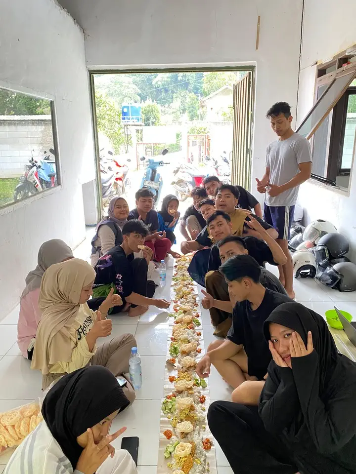 Menjelang sore, aroma nasi liwet dan lauk pauk mulai tercium. Waktu istirahat tiba! Kami duduk bersila di teras, menyantap hidangan sederhana tapi terasa spesial karena dinikmati bersama. Obrolan semakin hangat—mulai rencana kerja besok hingga curhat kangen rumah. Tawa dan canda menutup hari pertama dengan manis.