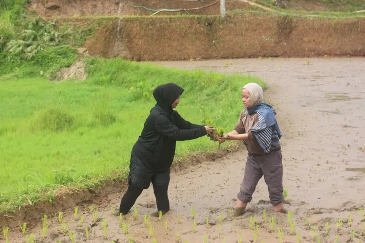 Tanpa ragu, kami menghampiri para petani dan menyapa mereka. Setelah berbincang sejenak, kami pun menawarkan diri untuk ikut serta membantu proses penanaman padi. Sambutan hangat dari warga membuat suasana semakin akrab. Kami diajari bagaimana cara menanam padi yang benar: mulai dari posisi tanam, teknik memegang bibit, hingga cara menjaga jarak antar baris agar pertumbuhan tanaman optimal.