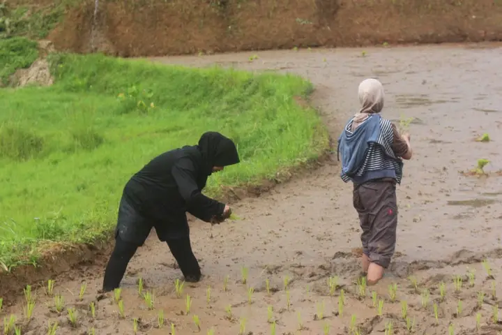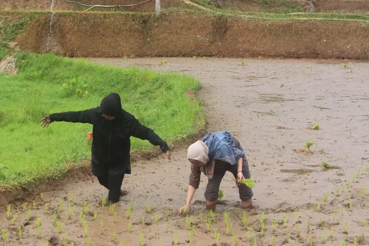 Tanpa ragu, kami menghampiri para petani dan menyapa mereka. Setelah berbincang sejenak, kami pun menawarkan diri untuk ikut serta membantu proses penanaman padi. Sambutan hangat dari warga membuat suasana semakin akrab. Kami diajari bagaimana cara menanam padi yang benar: mulai dari posisi tanam, teknik memegang bibit, hingga cara menjaga jarak antar baris agar pertumbuhan tanaman optimal.