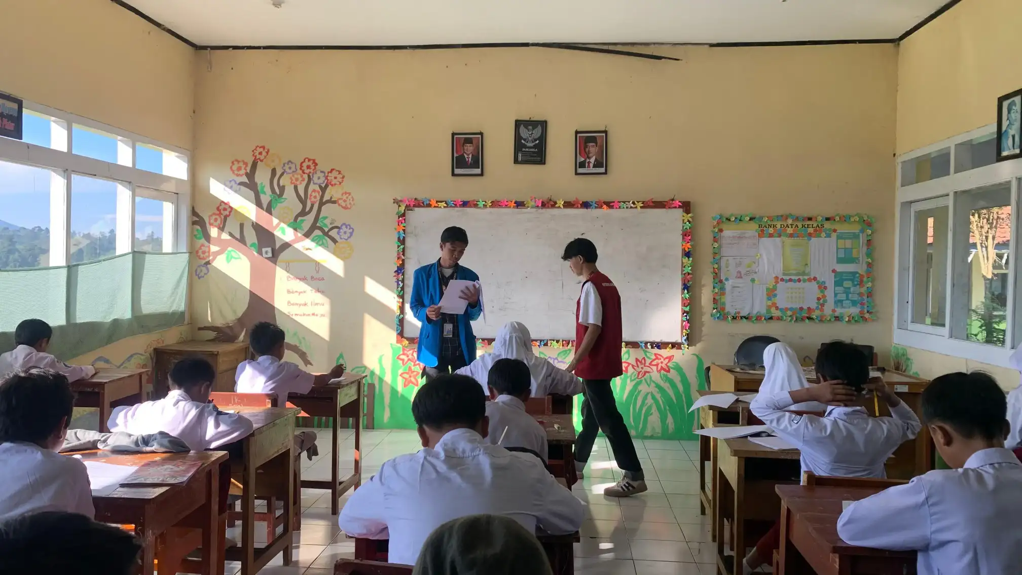 Kegiatan diawali pada pagi hari dengan kunjungan ke salah satu Sekolah Dasar setempat, di mana kami turut serta dalam mendukung dan mengawasi pelaksanaan ujian kenaikan kelas. Pengawasan difokuskan pada kelas 3, 4, dan 5, yang sedang menjalani ujian secara serentak. Dalam peran kami sebagai pendamping, kami membantu guru menjaga ketertiban dan kelancaran proses ujian. Kehangatan sambutan dari para guru serta respons positif dari para siswa membuat suasana pengawasan menjadi menyenangkan. Kedekatan yang terjalin dengan siswa menciptakan suasana yang akrab dan penuh semangat, memberikan pengalaman berharga dalam bidang pendidikan.